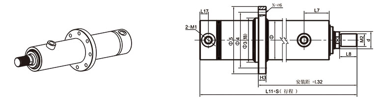 活塞桿端為外螺紋桿頭耳環(huán)連接