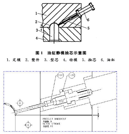 當滑塊行程較大或動?;瑝K向動模邊傾斜較大時,如用斜邊抽芯,其受力較差,容易損壞;可用油缸而改善受力狀況。