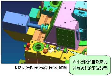 在模具結(jié)構(gòu)中油缸應(yīng)有行程限位控制開關(guān),確?;钊讼?;同時應(yīng)具備模具生產(chǎn)時自動控制所必須的信號源。