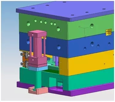 滑塊的兩個極限位置都應(yīng)設(shè)計可調(diào)節(jié)的行程開關(guān)。當(dāng)頂出零件與滑塊有干涉時,頂針組板要復(fù)位后才合滑塊,且滑塊合攏后才能合模。