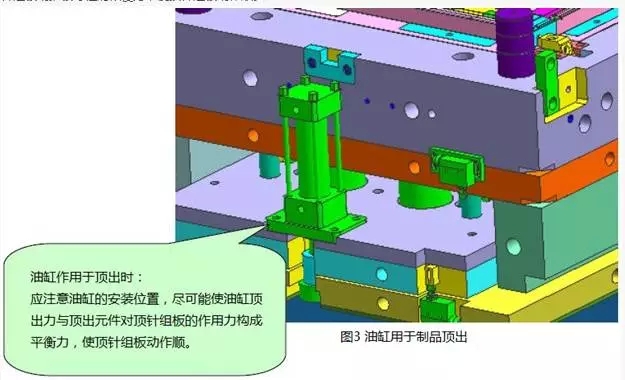 在此類應(yīng)用中,應(yīng)注意油缸的安裝位置,盡可能使油缸頂出力與頂出元件對頂針組板的作用力構(gòu)成平衡力系,減少頂針組板動推板導(dǎo)柱的傾覆力,使頂針組板動作順。