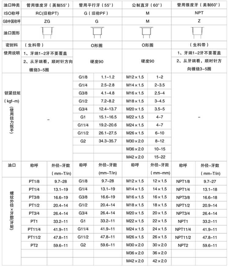 液壓油缸的進(jìn)出油口種類、油口尺寸對(duì)照表